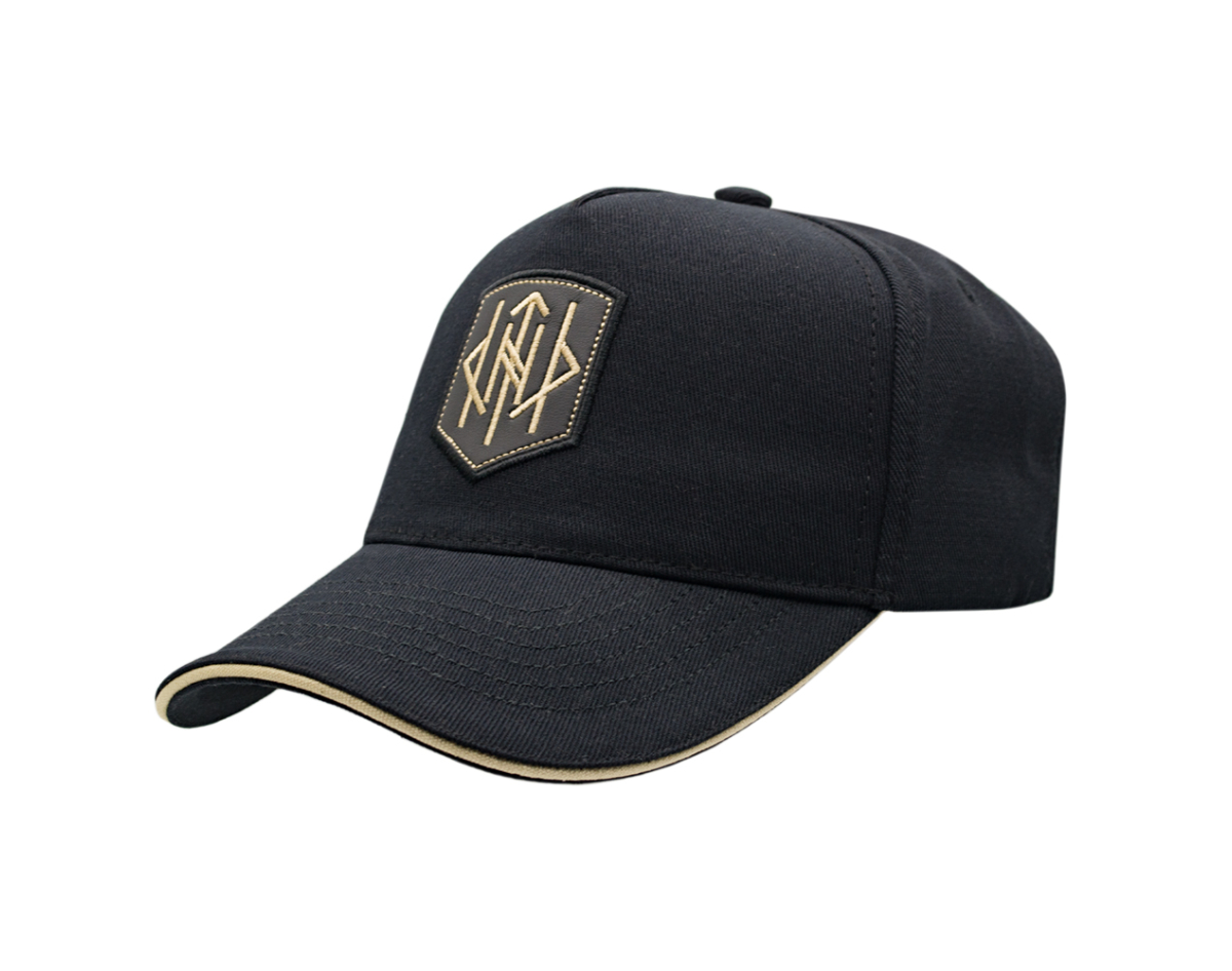 Black baseball cap with a Trident patch in the form of runes (uacp-004) Material 78% cotton, 22% polyester, lining 100% cotton. Stylish baseball cap with a patch. The patch is made of eco-leather, stitched along the edges and embroidered with threads. Size 56-58, but at the back you can adjust it to increase or decrease the size.
