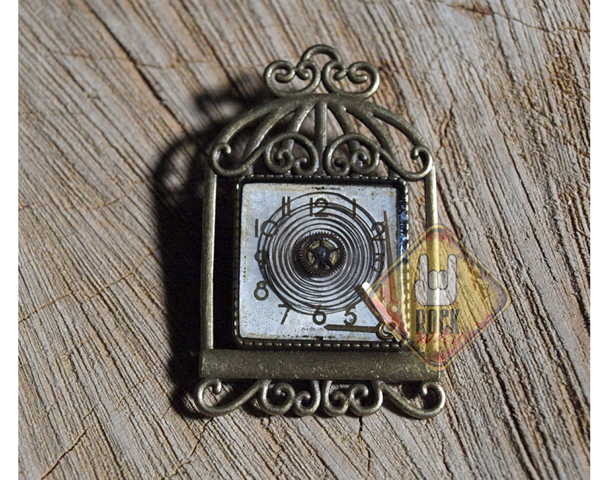 Steampunk brooch in the form of a cage with mechanical elements inside.