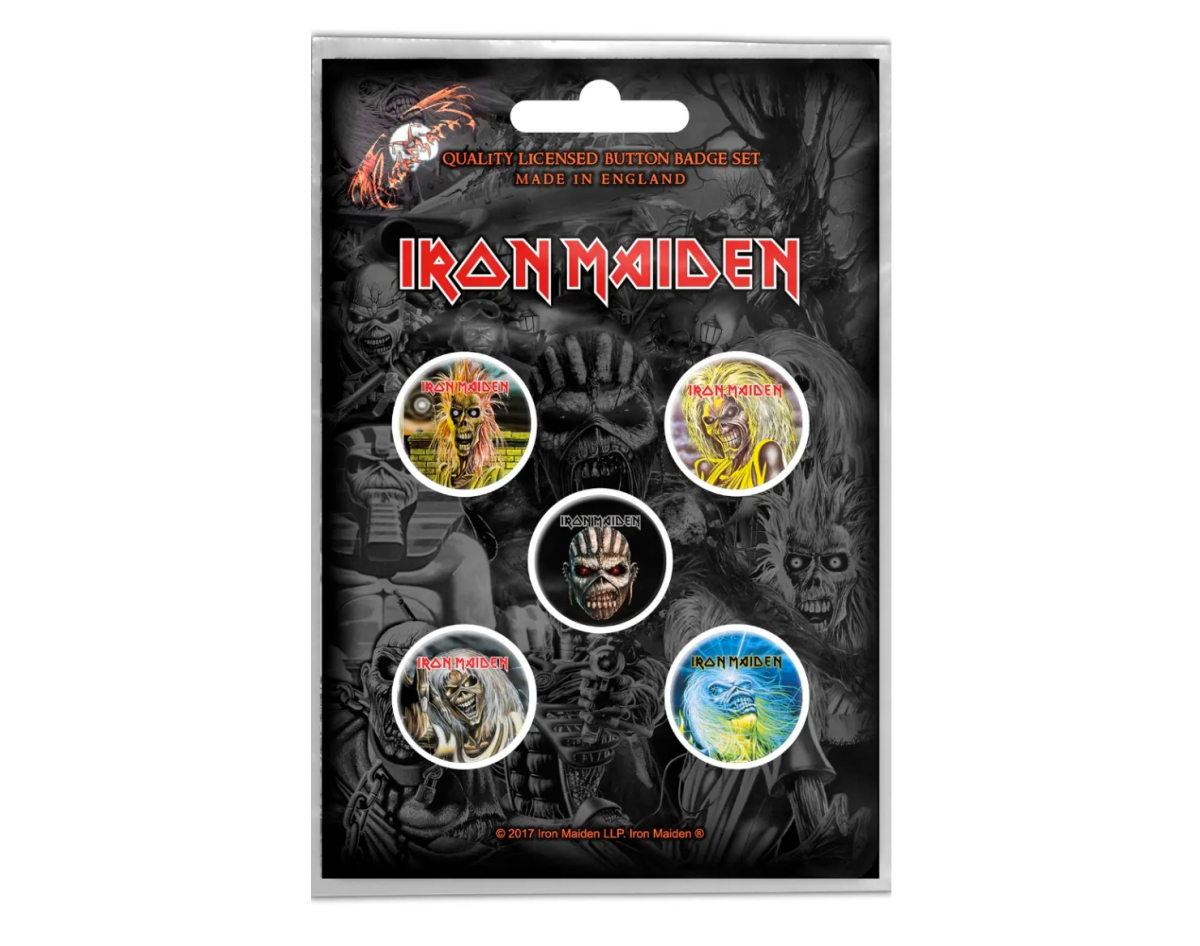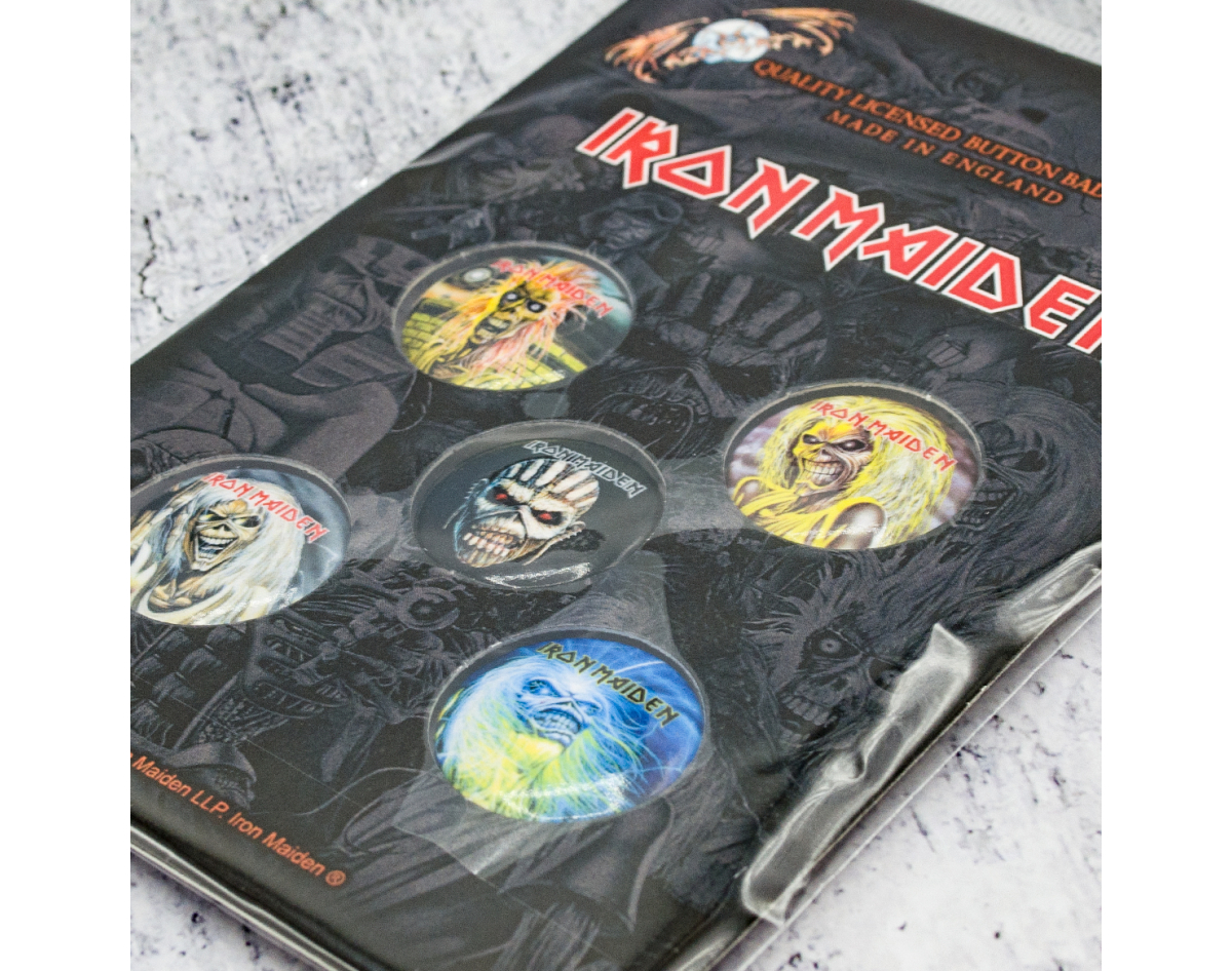Gift set of badges. This product is officially licensed merchandise. Badges with a high-quality detailed image on a plastic base are equipped with a reliable metal pin on the back. The lot number is indicated on each icon on the reverse side. Each set of five icons is packed in a blister on a cardboard base with a stylized image of the band or album to which the specific set is dedicated, a presentable look, this is an ideal gift for true fans of the band. Made in England.