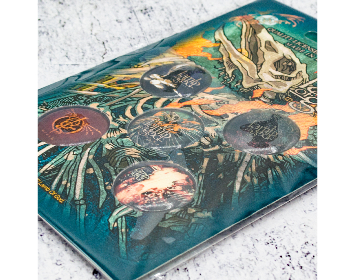 Gift set of badges. This product is officially licensed merchandise. Badges with a high-quality detailed image on a plastic base are equipped with a reliable metal pin on the back. The lot number is indicated on each icon on the reverse side. Each set of five icons is packed in a blister on a cardboard base with a stylized image of the band or album to which the specific set is dedicated, a presentable look, this is an ideal gift for true fans of the band. Made in England.
