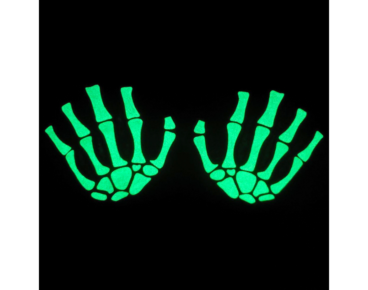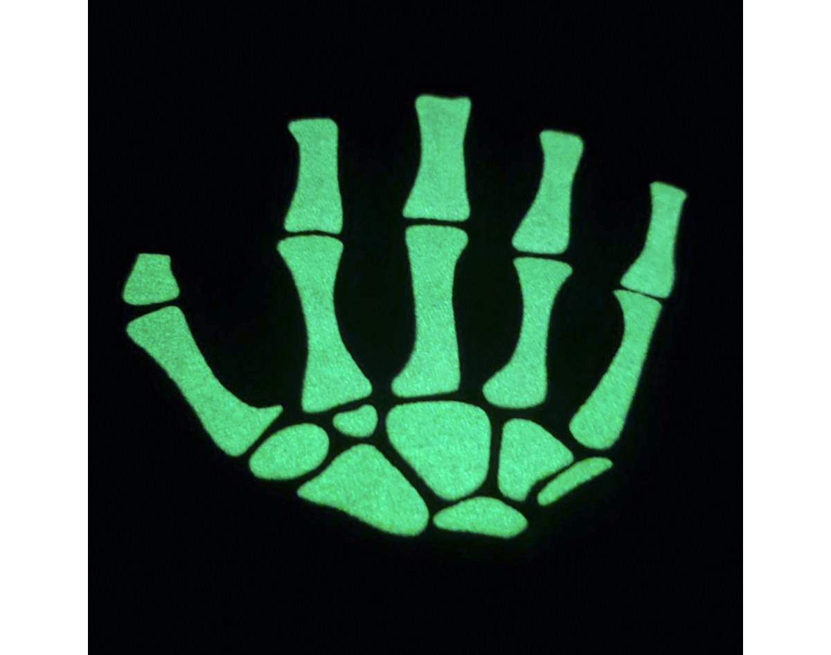 A stylized image is applied to the gloves, which, if held in the light, then glows in the dark.