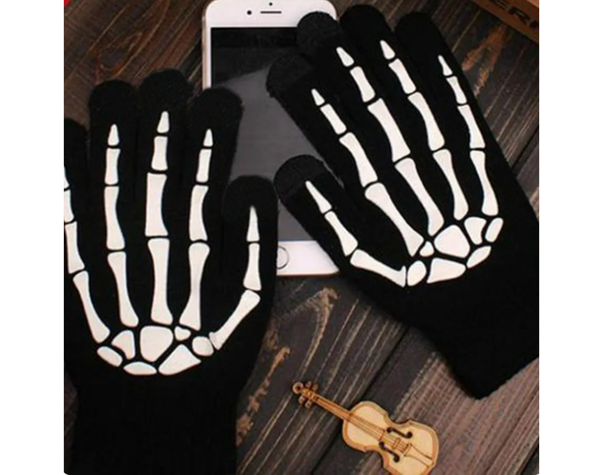 Black knitted gloves made of acrylic. Acrylic is durable and resistant to rubbing. The gloves stretch quite well and will fit both a woman's and a man's hand. The gloves have a stylized image that, if held up to the light, then glows in the dark. The first three fingers on the gloves are touch-sensitive, so you can use a phone, tablet and other devices with a touch screen without removing them. This stylish accessory will complement your image along with other products from our store.