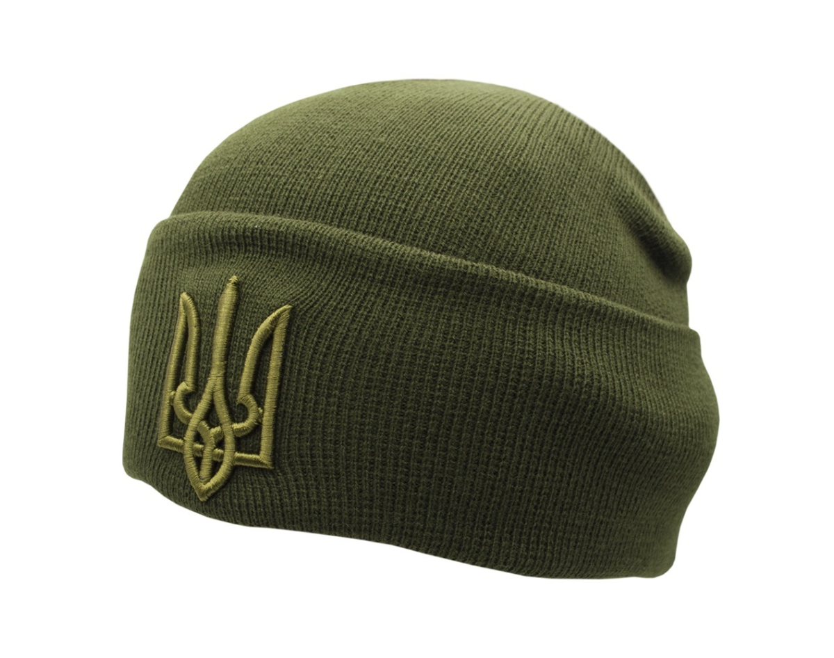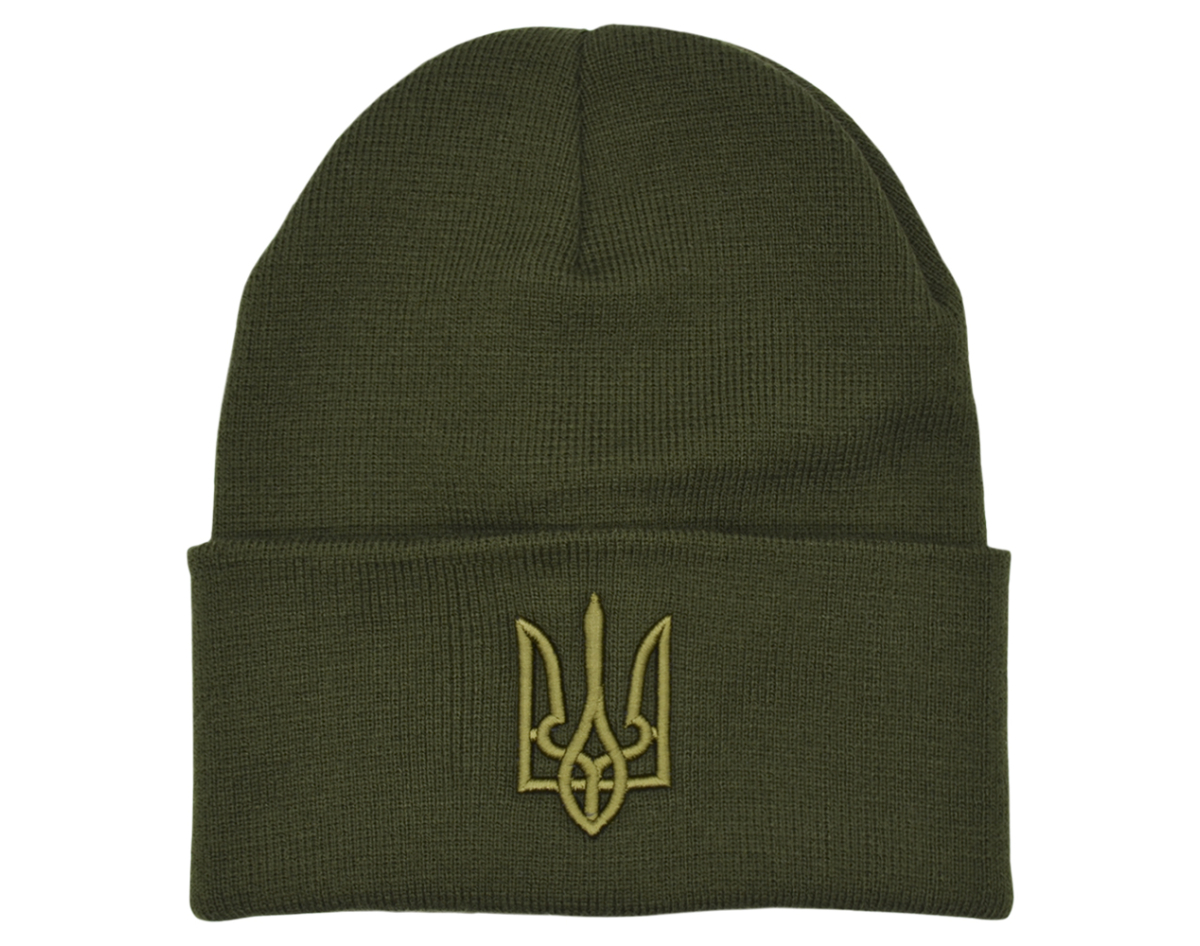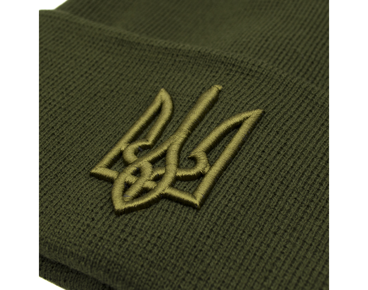 Knitted warm double cap with voluminous high-quality embroidery. Fabric composition: wool 50%, acrylic 50%
