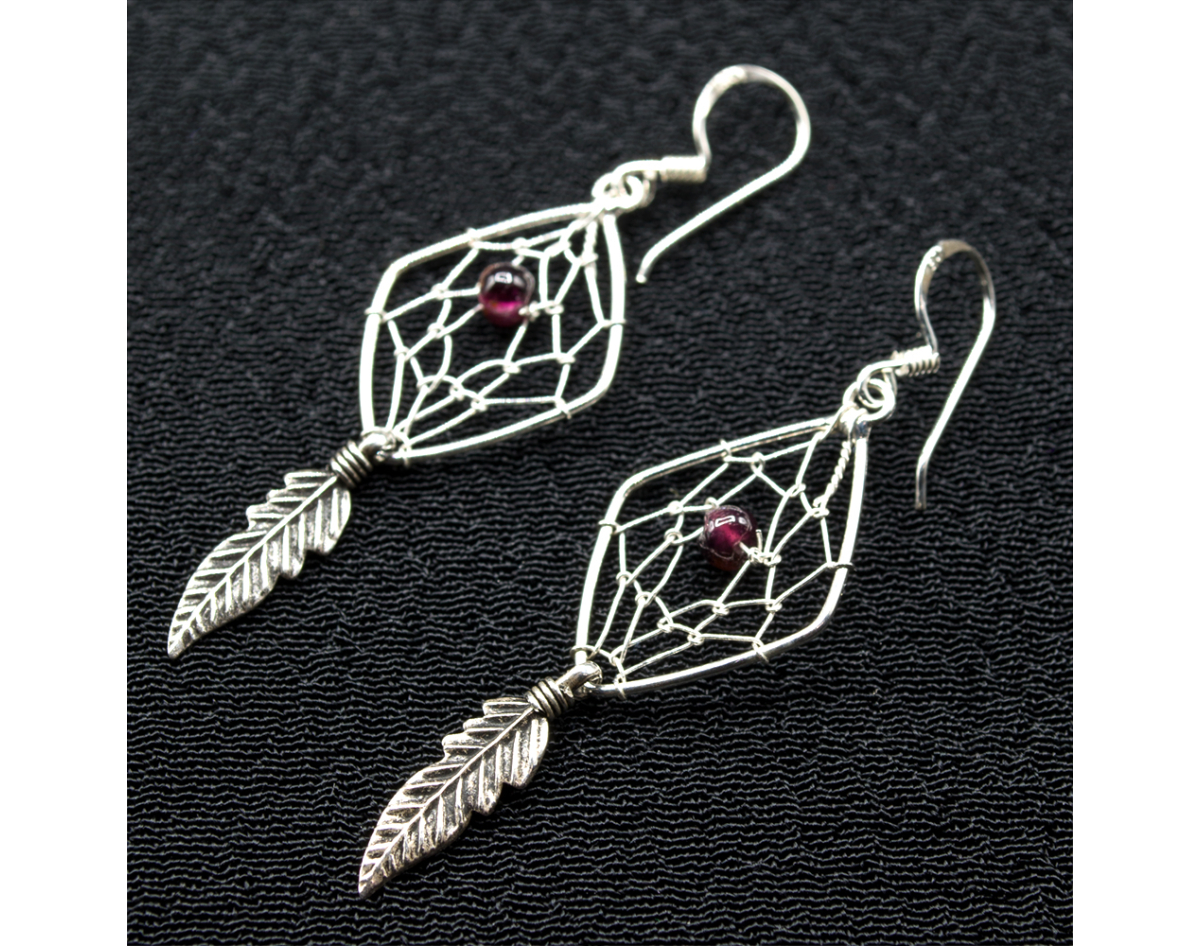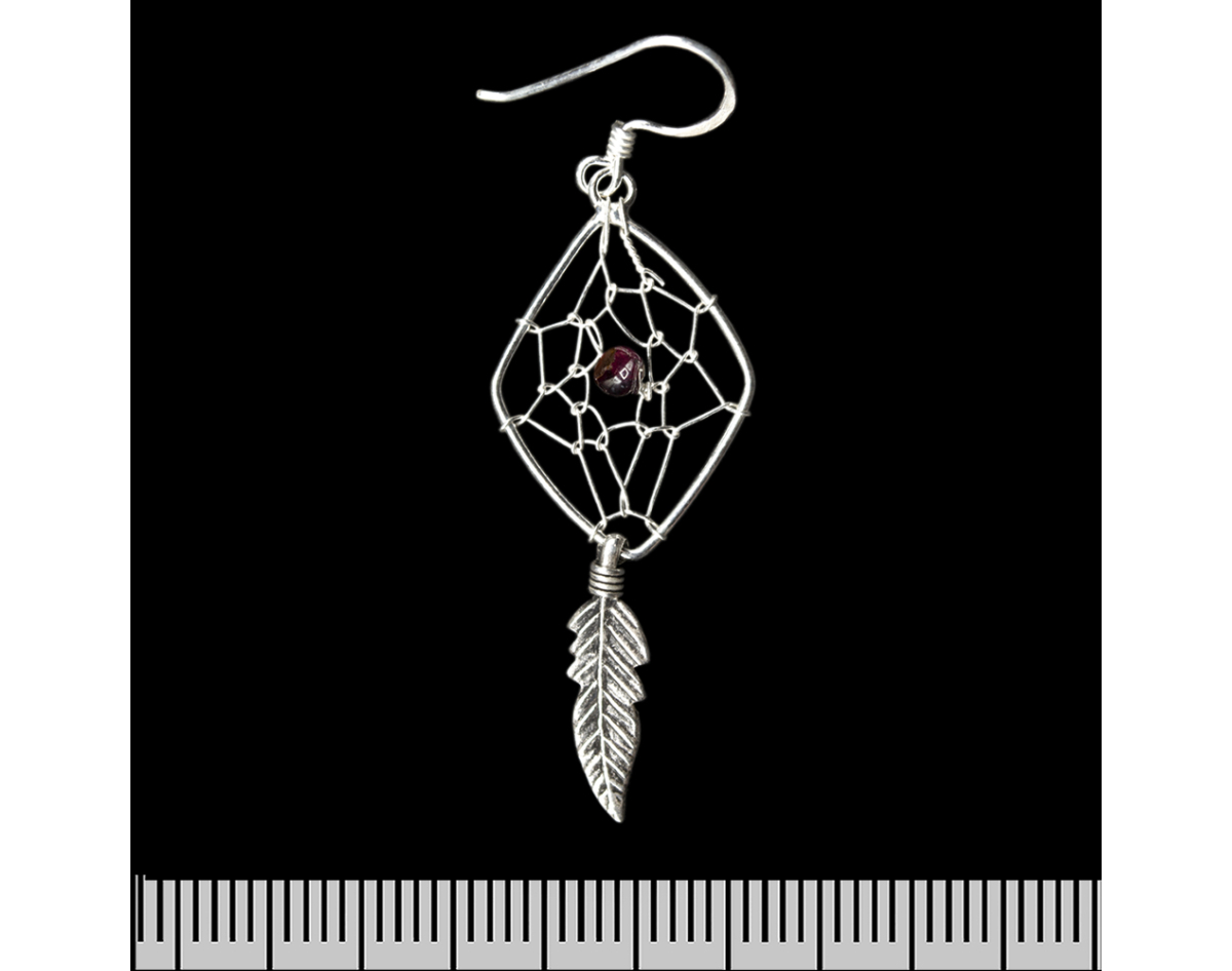 Hook earring Dreamcatcher with burgundy stone and feather, rhombus (silver, 925 assay value) (ehs-027)