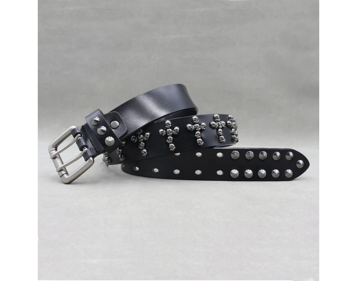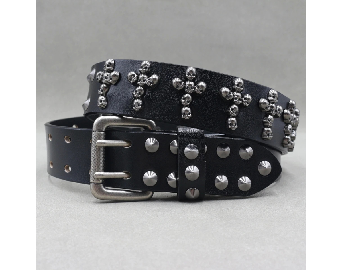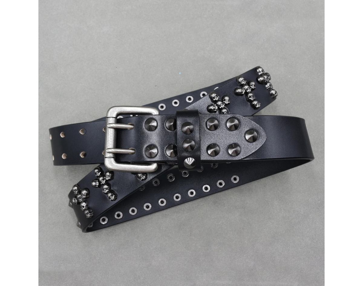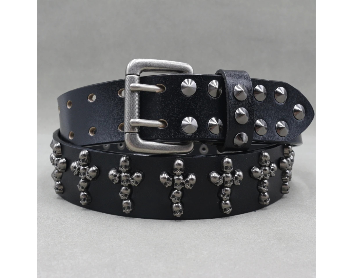 Leather belt Two rows of conical spikes and crosses of skulls (bсl-003)