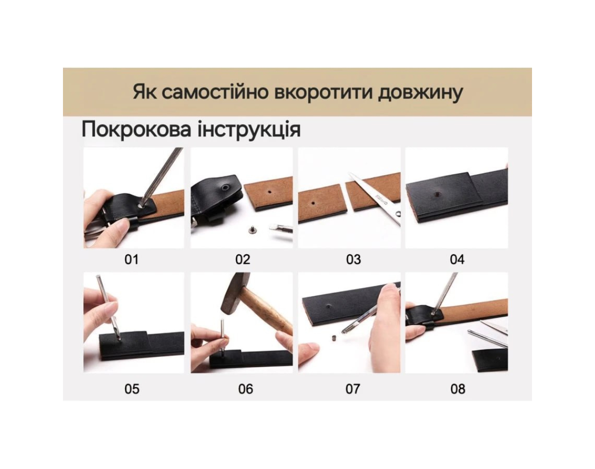The belt is made of genuine leather and high-quality stainless metal fittings. The total length from the edge of the buckle to the edge of the belt is 108 cm, the length from the edge of the buckle to the first holes is 81 cm, to the extreme holes is 89 cm. The width is 3.7 cm. If the belt is long, then we have added a photo instruction on how to shorten it correctly, but we recommend that this be done by professionals in a leather goods repair shop so that they can take accurate measurements and do everything correctly.