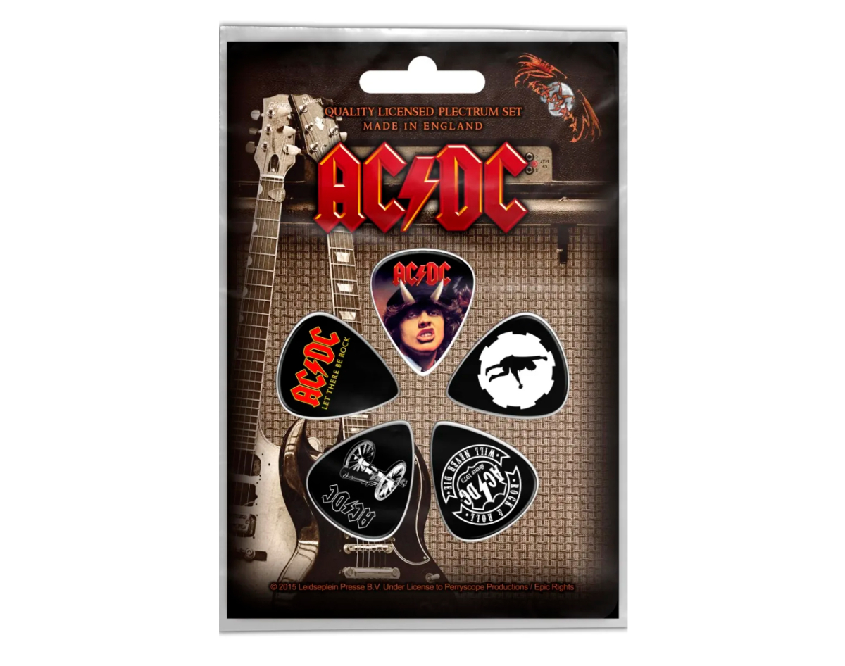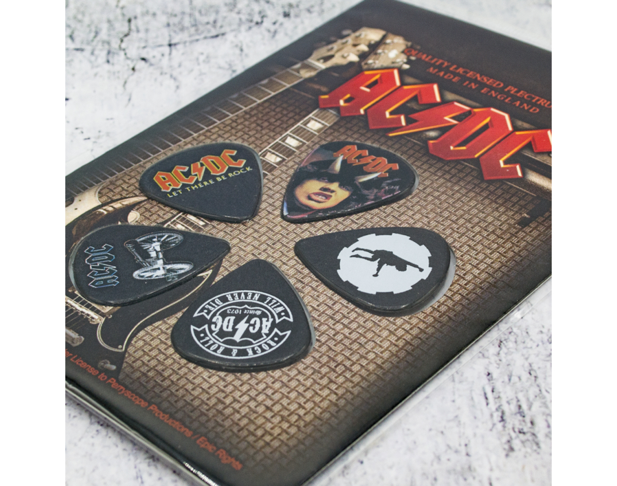 Gift set of mediators. This product is an official licensed merch (Officially Licensed). Picks with high-quality detailed image, made of PVC, thickness 1.14 mm, flexibility corresponds to picks of medium classification. Each set of five picks is packed in a blister on a cardboard base with a stylized image of the group or album to which a specific set is dedicated, has a presentable appearance, it is an ideal gift for true fans of the group, for beginners and professional musicians and as just a really beautiful and original souvenir. Made in England.