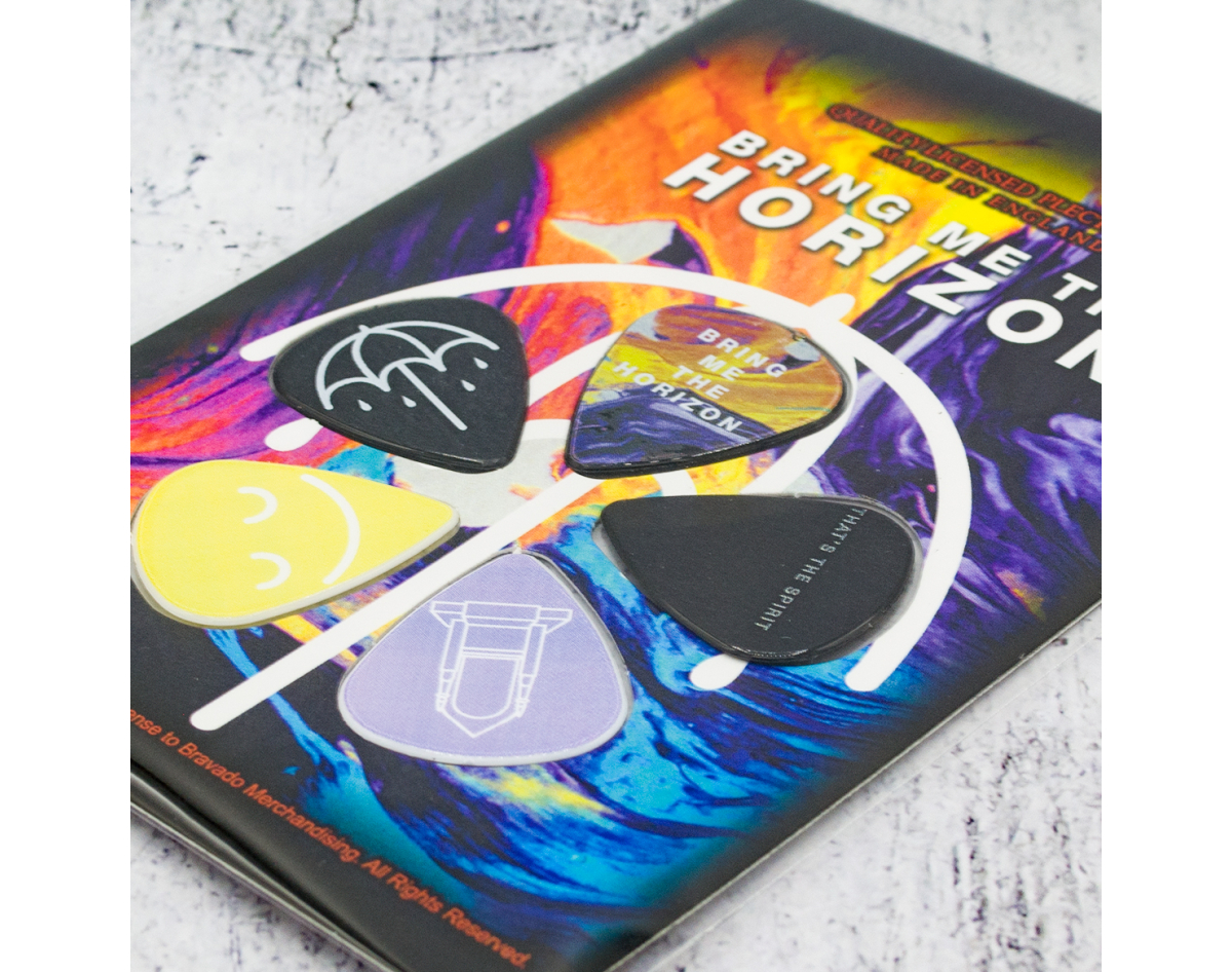 Gift set of mediators. This product is an official licensed merch (Officially Licensed). Picks with high-quality detailed image, made of PVC, thickness 1.14 mm, flexibility corresponds to picks of medium classification. Each set of five picks is packed in a blister on a cardboard base with a stylized image of the group or album to which a specific set is dedicated, has a presentable appearance, it is an ideal gift for true fans of the group, for beginners and professional musicians and as just a really beautiful and original souvenir. Made in England.