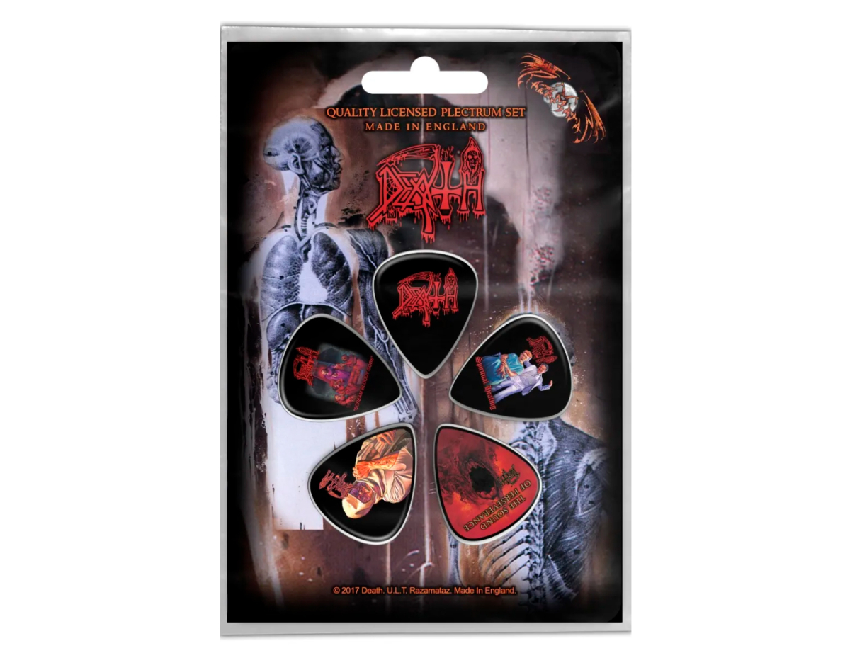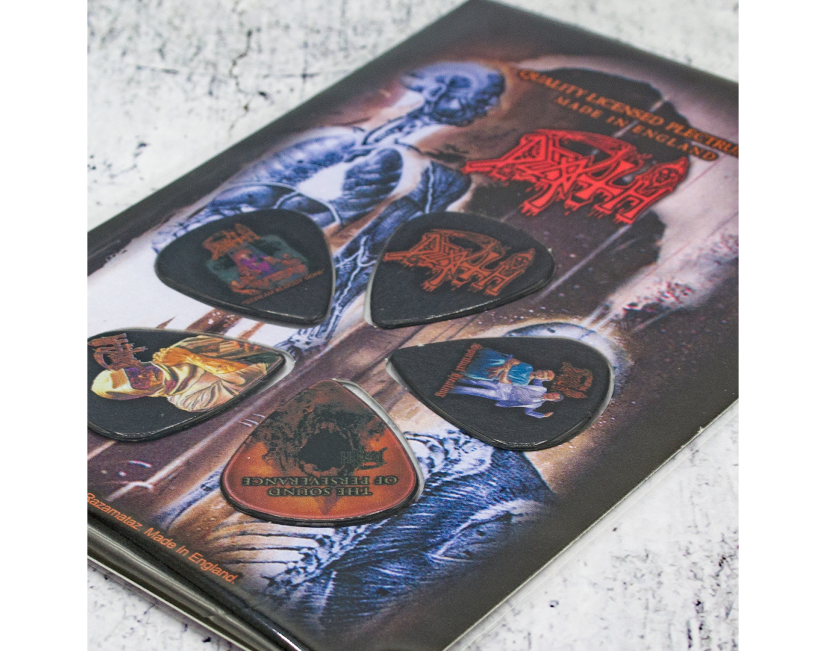 Gift set of mediators. This product is an official licensed merch (Officially Licensed). Picks with high-quality detailed image, made of PVC, thickness 1.14 mm, flexibility corresponds to picks of medium classification. Each set of five picks is packed in a blister on a cardboard base with a stylized image of the group or album to which a specific set is dedicated, has a presentable appearance, it is an ideal gift for true fans of the group, for beginners and professional musicians and as just a really beautiful and original souvenir. Made in England.