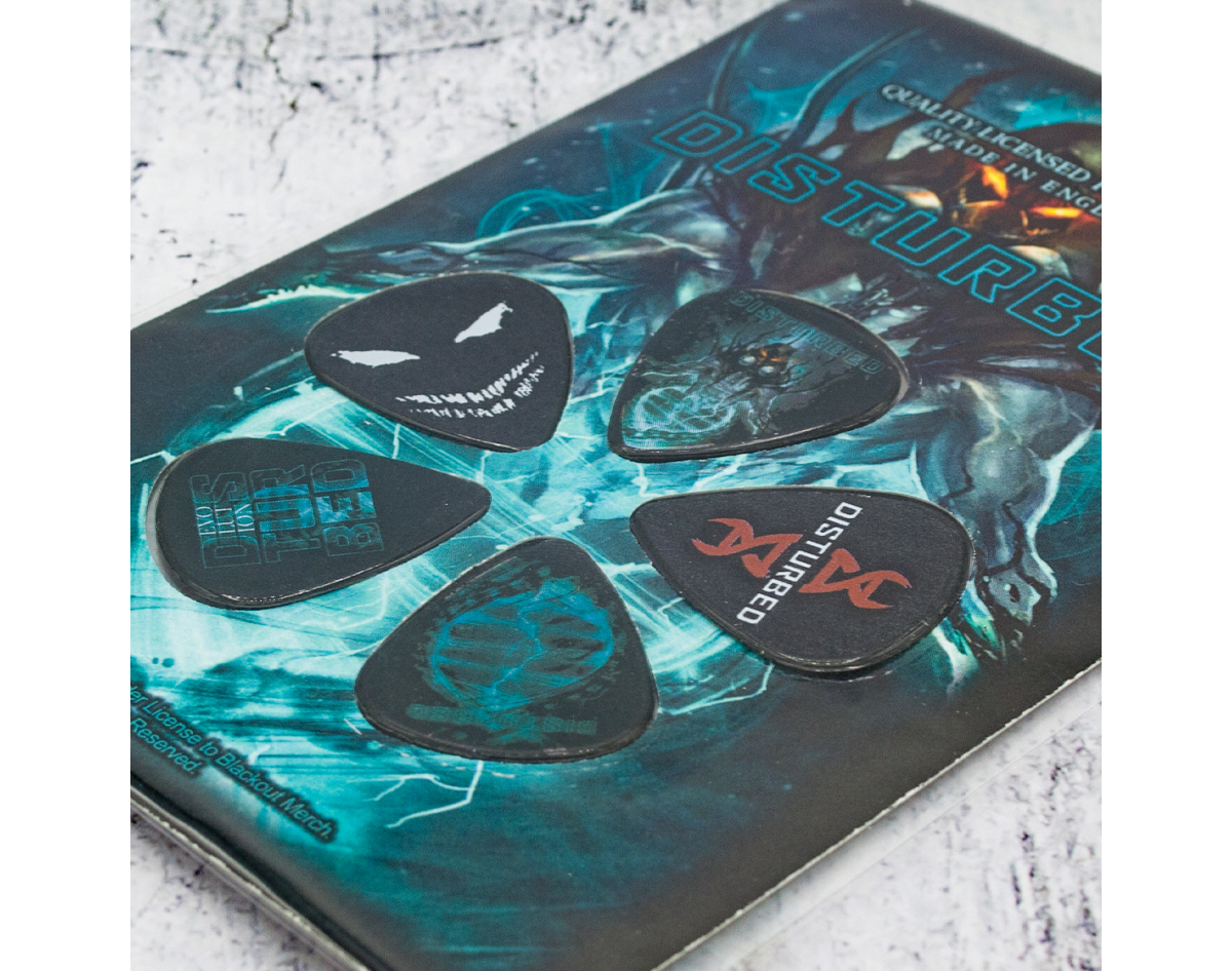 Gift set of mediators. This product is an official licensed merch (Officially Licensed). Picks with high-quality detailed image, made of PVC, thickness 1.14 mm, flexibility corresponds to picks of medium classification. Each set of five picks is packed in a blister on a cardboard base with a stylized image of the group or album to which a specific set is dedicated, has a presentable appearance, it is an ideal gift for true fans of the group, for beginners and professional musicians and as just a really beautiful and original souvenir. Made in England.