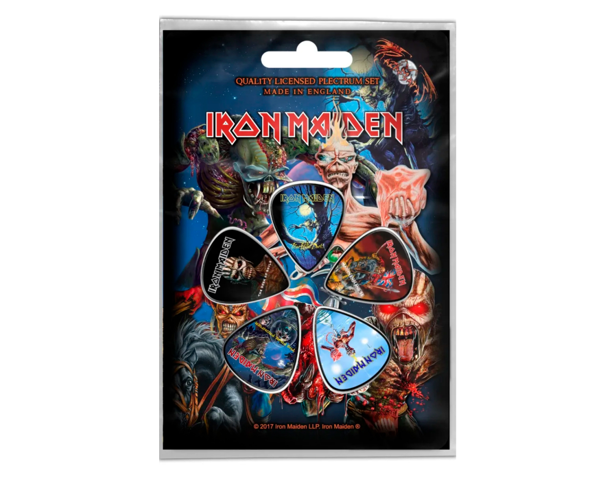 Gift set of mediators. This product is an official licensed merch (Officially Licensed). Picks with high-quality detailed image, made of PVC, thickness 1.14 mm, flexibility corresponds to picks of medium classification. Each set of five picks is packed in a blister on a cardboard base with a stylized image of the group or album to which a specific set is dedicated, has a presentable appearance, it is an ideal gift for true fans of the group, for beginners and professional musicians and as just a really beautiful and original souvenir. Made in England.