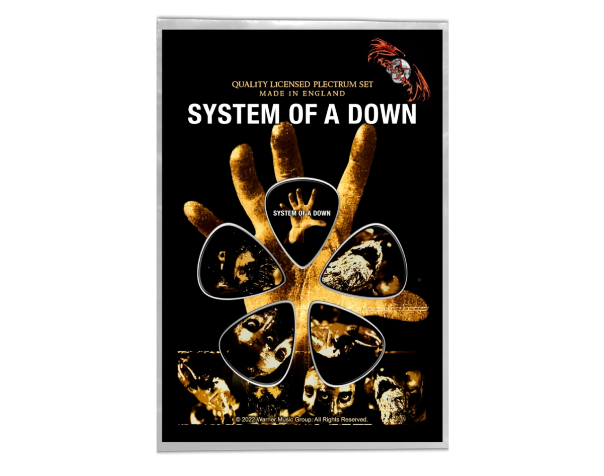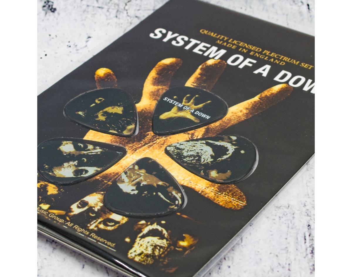 Gift set of mediators. This product is an official licensed merch (Officially Licensed). Picks with high-quality detailed image, made of PVC, thickness 1.14 mm, flexibility corresponds to picks of medium classification. Each set of five picks is packed in a blister on a cardboard base with a stylized image of the group or album to which a specific set is dedicated, has a presentable appearance, it is an ideal gift for true fans of the group, for beginners and professional musicians and as just a really beautiful and original souvenir. Made in England.