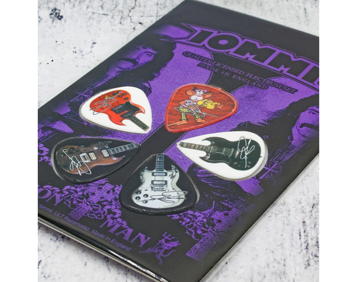 Gift set of mediators. This product is an official licensed merch (Officially Licensed). Picks with high-quality detailed image, made of PVC, thickness 1.14 mm, flexibility corresponds to picks of medium classification. Each set of five picks is packed in a blister on a cardboard base with a stylized image of the group or album to which a specific set is dedicated, has a presentable appearance, it is an ideal gift for true fans of the group, for beginners and professional musicians and as just a really beautiful and original souvenir. Made in England.