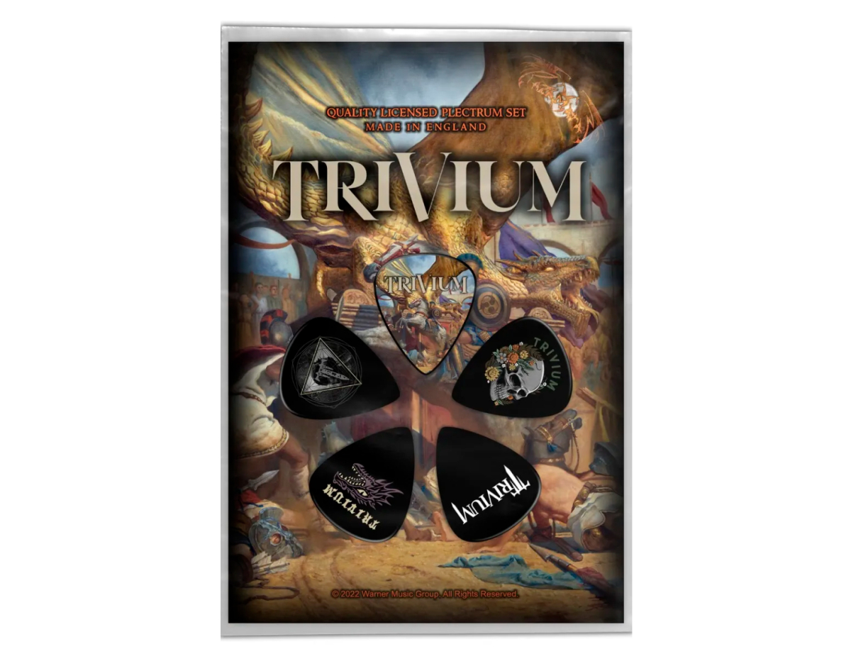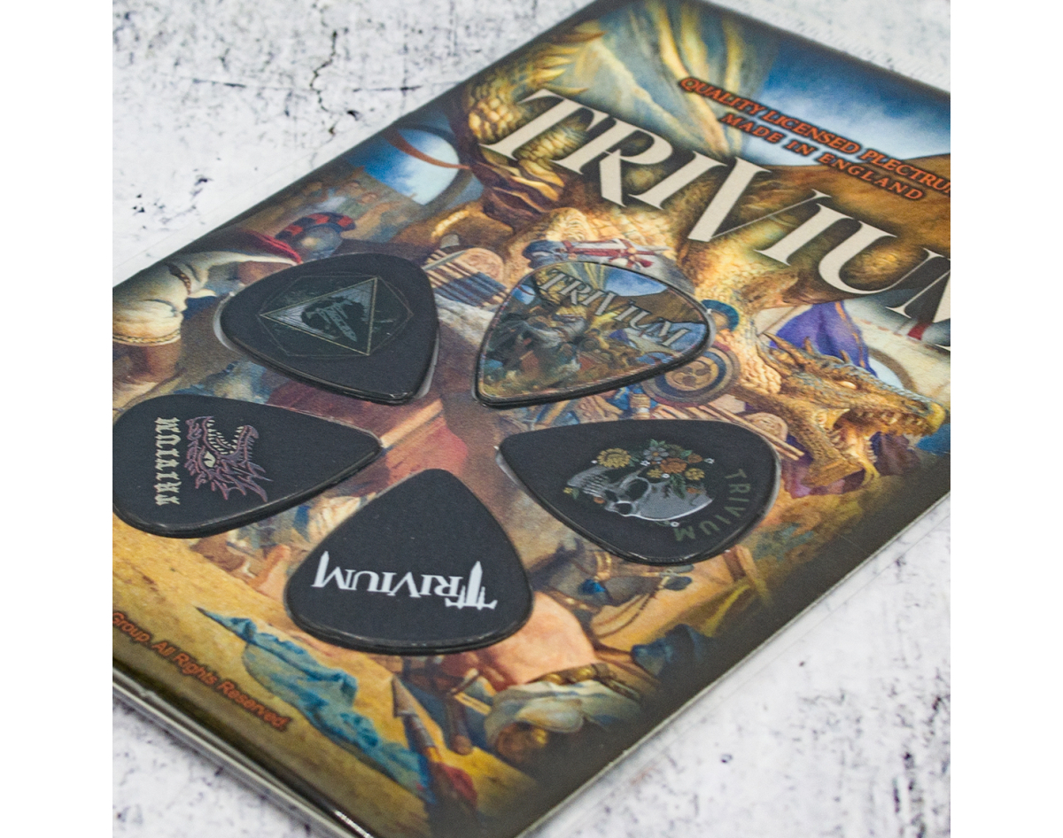 Gift set of mediators. This product is an official licensed merch (Officially Licensed). Picks with high-quality detailed image, made of PVC, thickness 1.14 mm, flexibility corresponds to picks of medium classification. Each set of five picks is packed in a blister on a cardboard base with a stylized image of the group or album to which a specific set is dedicated, has a presentable appearance, it is an ideal gift for true fans of the group, for beginners and professional musicians and as just a really beautiful and original souvenir. Made in England.