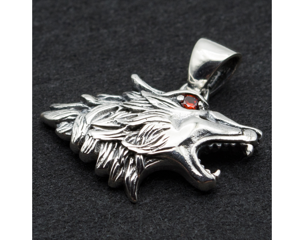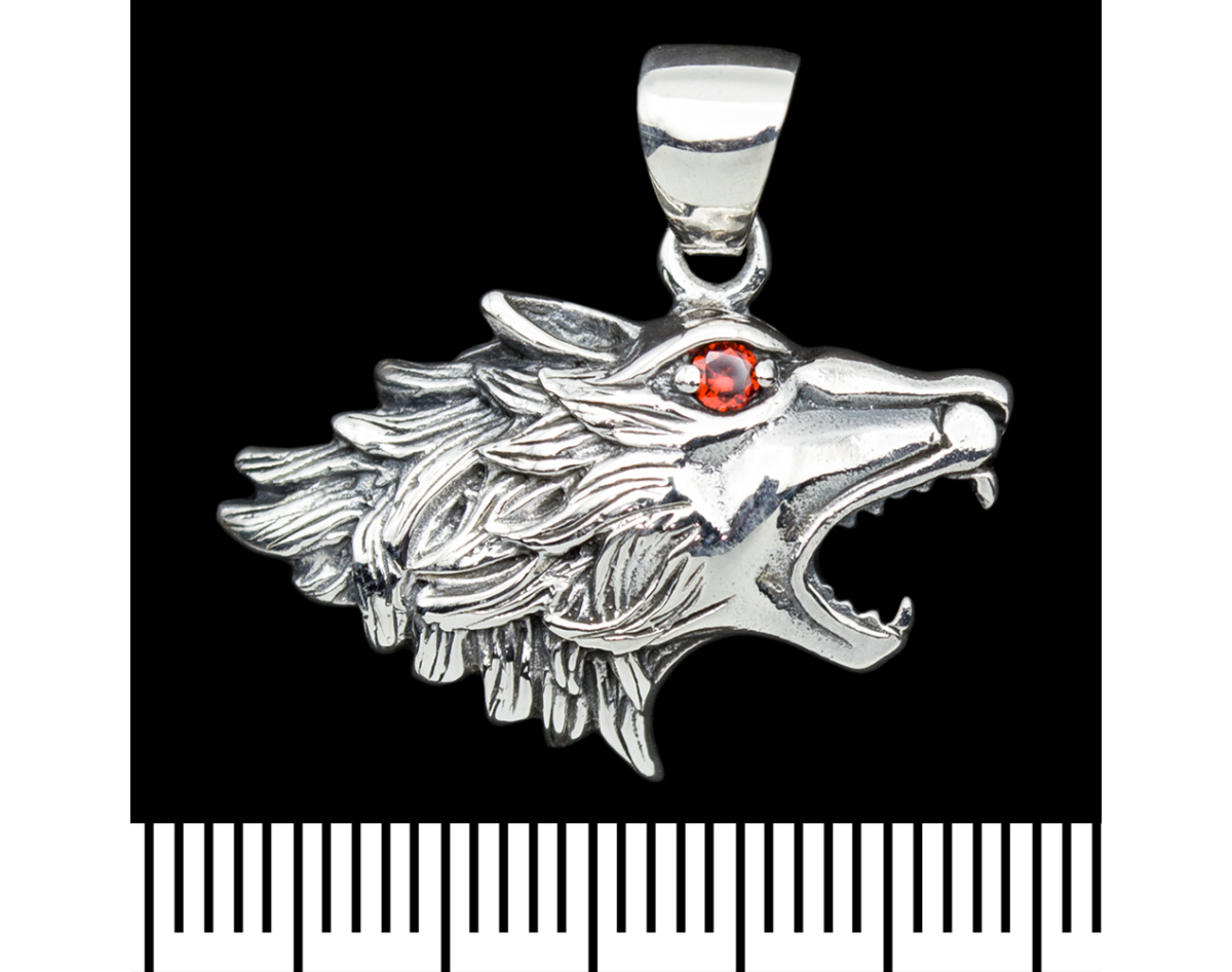 Pendant Howling wolf with red eyes (head) (silver, 925 sample) (sp-192)
