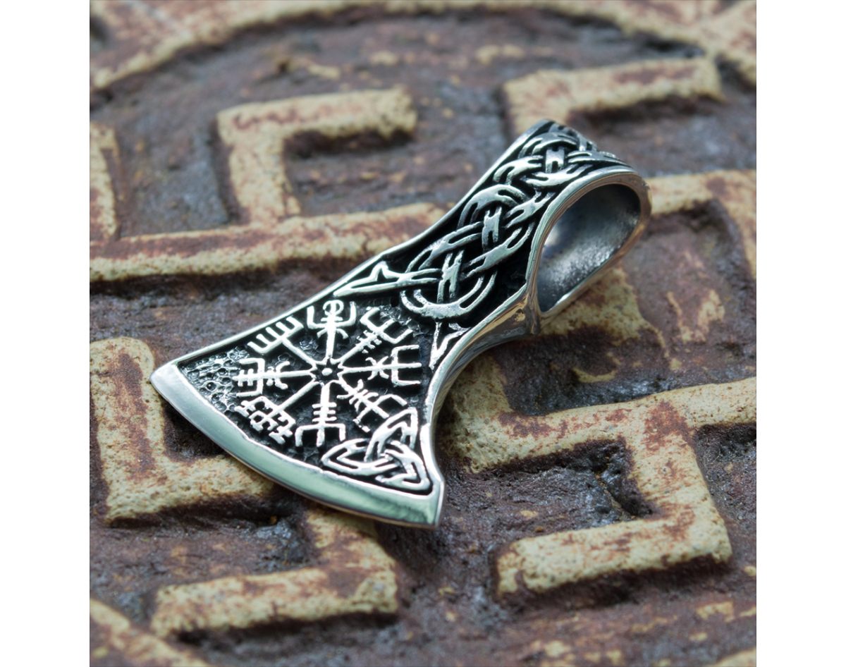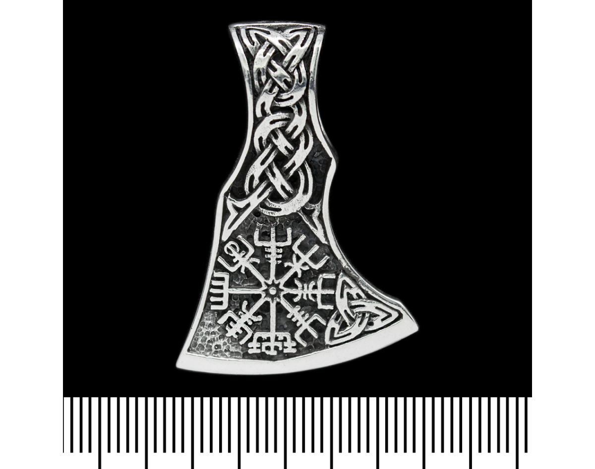 Pendant of the Ax of Perun with the runic compass Vegvizir (silver, 925) (sp-126) 10.25 grams, height 38 mm, width 27 mm, eye size for the chain 12x8 mm