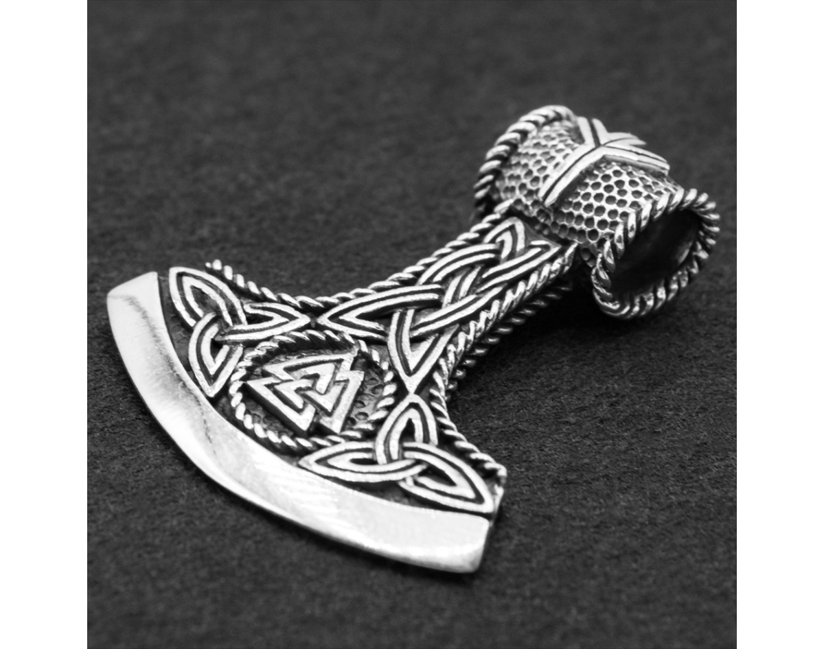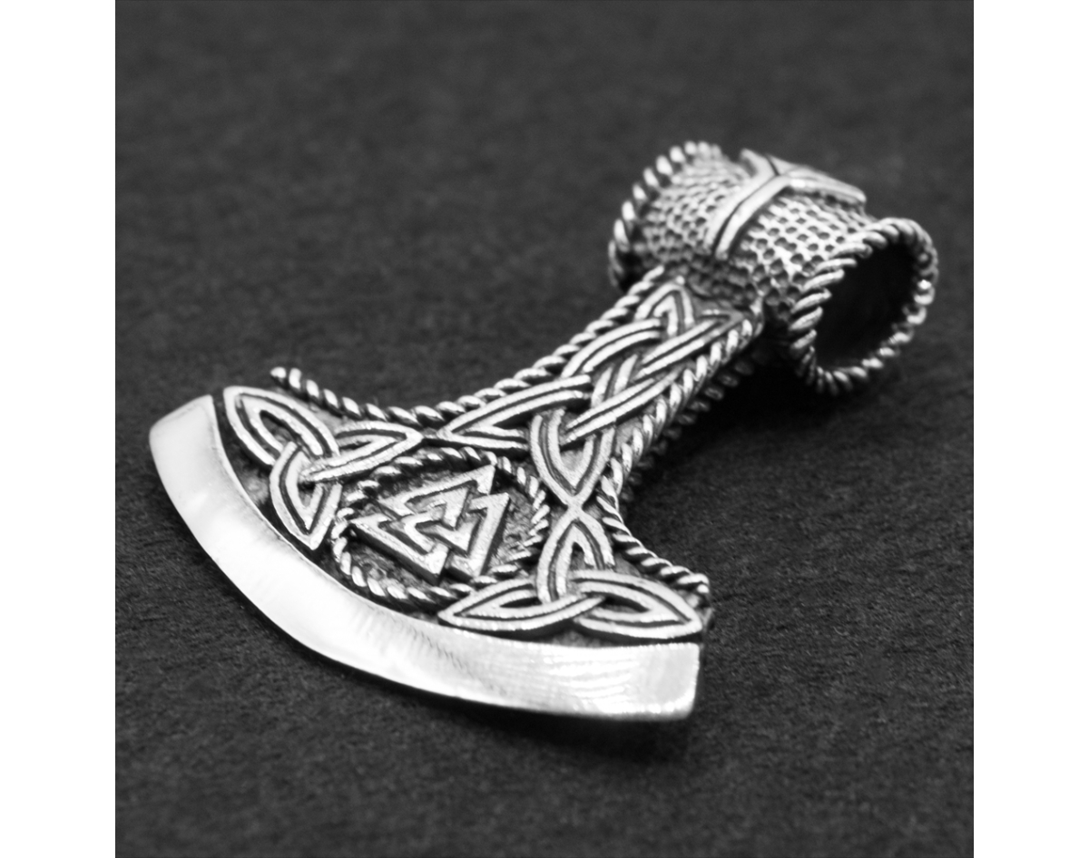 Pendant Perun's Axe with Valknut and Algiz rune (silver, 925 sample) (sp-215) 10.9 grams, height 38 mm, width 33 mm, size of the eye for the chain 7x6 mm