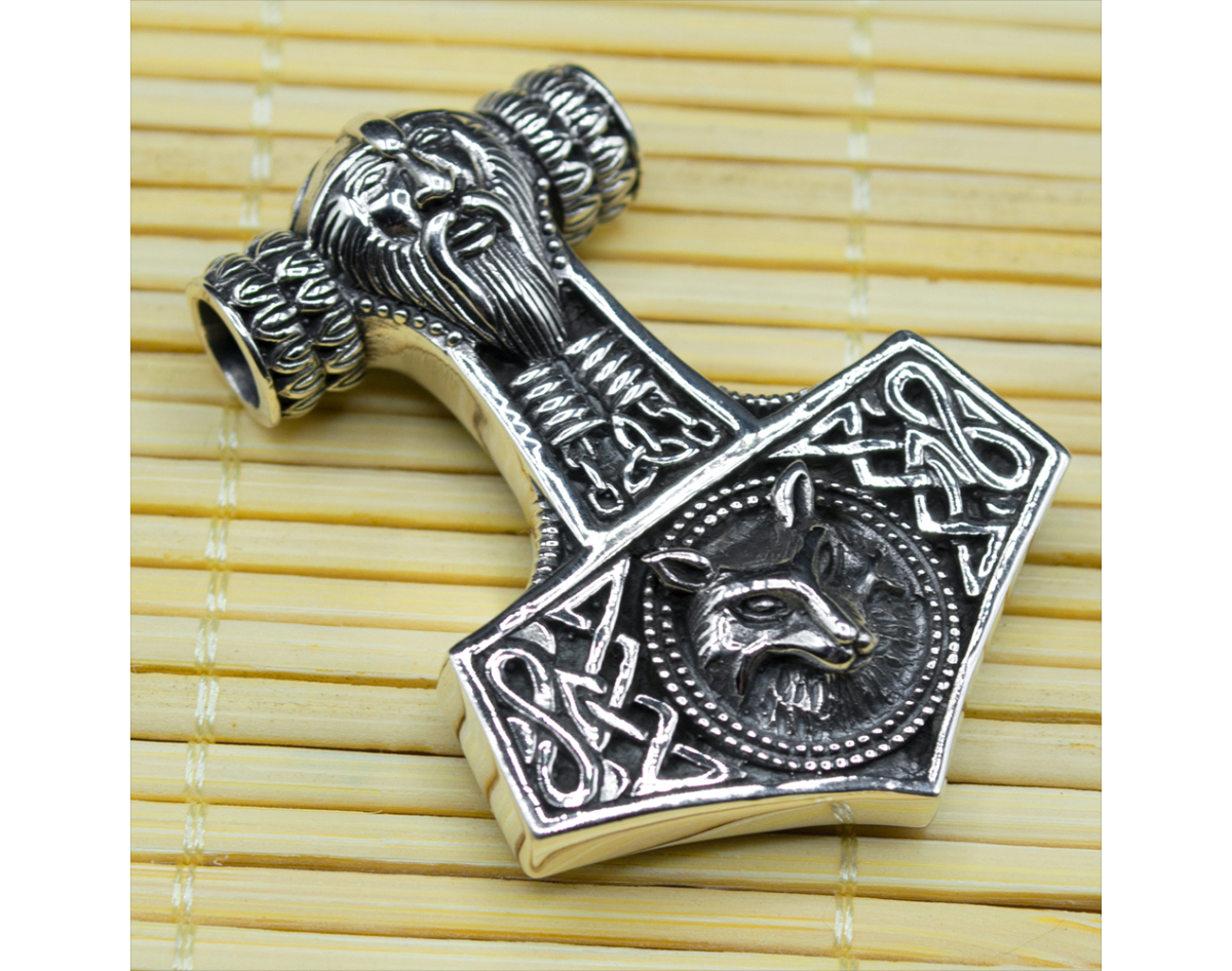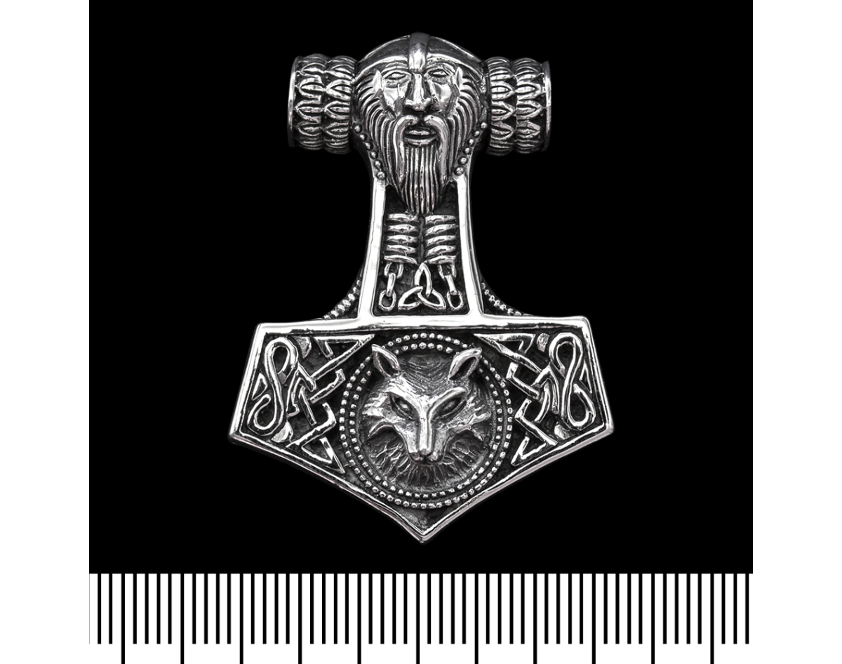 Pendant Thor's Hammer with Thor and a wolf's head (silver, 925 assay value) (sp-123)