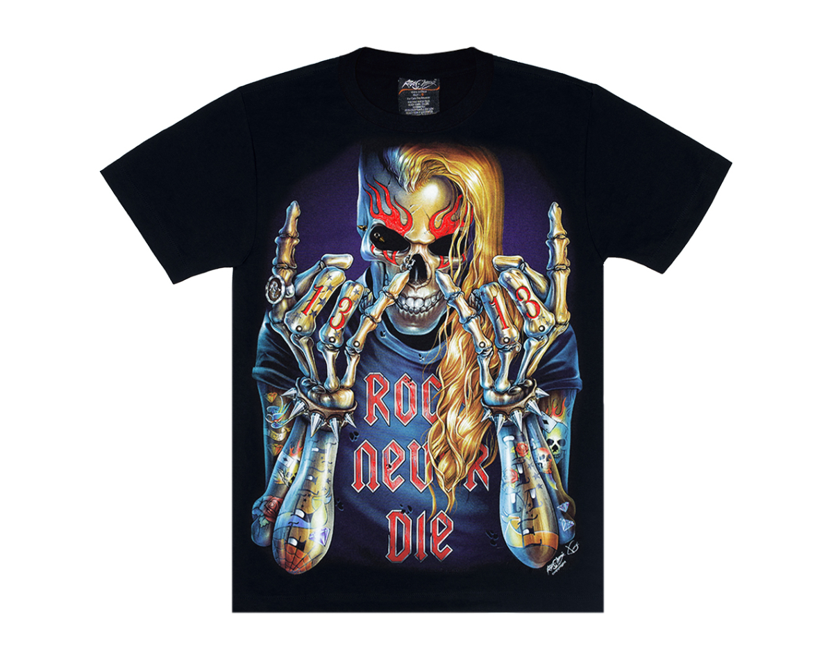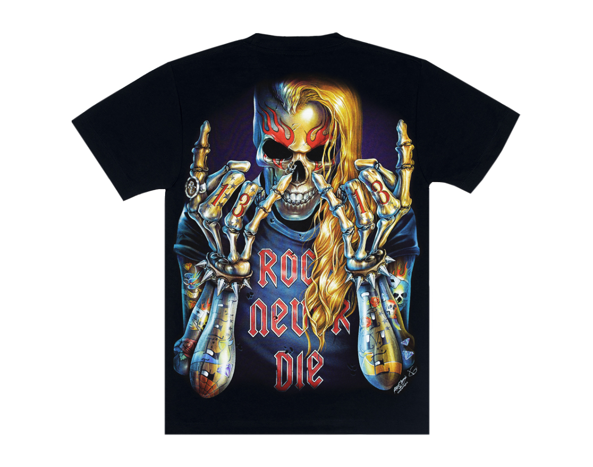 Skeleton with Tattoos (Rock Never Die) (3D, glows in the dark) T-Shirt