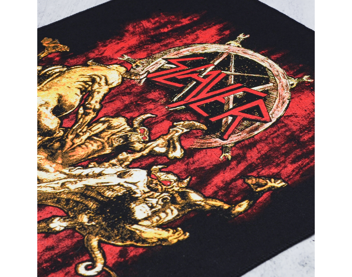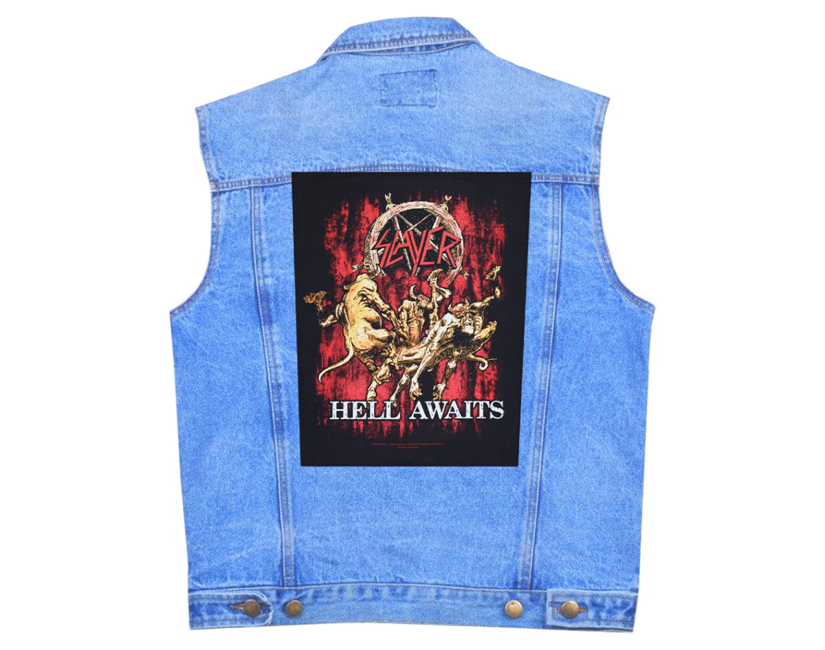 Slayer "Hell Awaits" back patch (olbp-002) Height 36 cm, width at the top edge 30 cm, width at the bottom edge 26 cm This product is Officially Licensed Backpath merch. Back patch of high premium quality. The edges of the patch are trimmed with overlock, which is why the stitching looks as neat as possible. The image was applied using the stencil method, the high level of detail indicates the imperfect paint of the paint. The patch is sewn on, soft, perfectly repeatable on the waistband. Fabric warehouse: cotton/polyester. Made in Great Britain