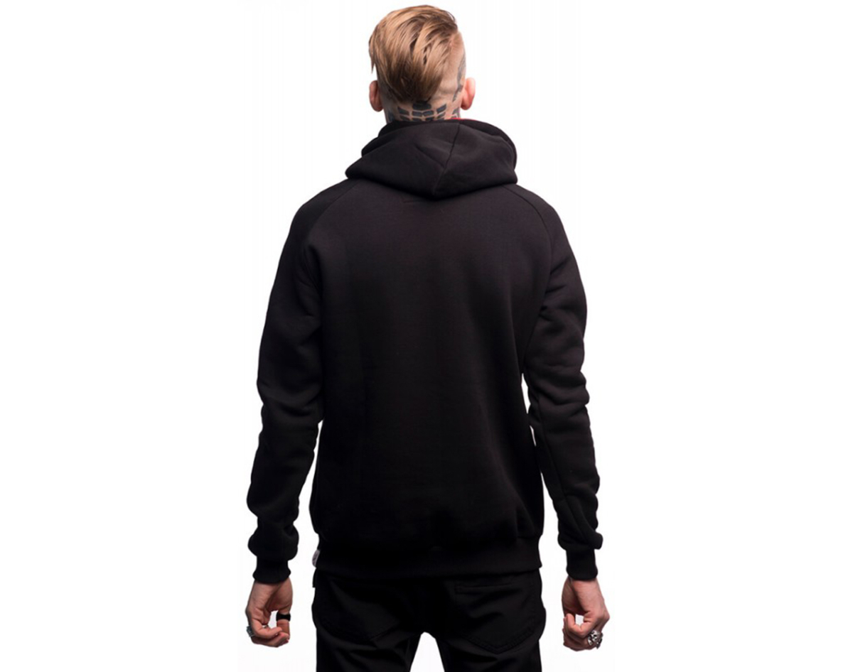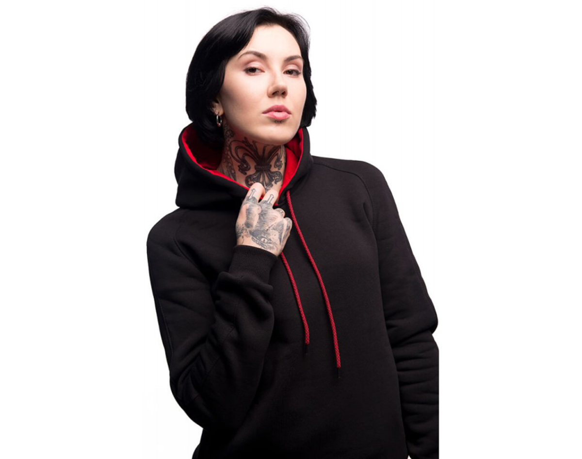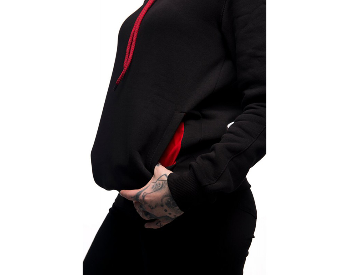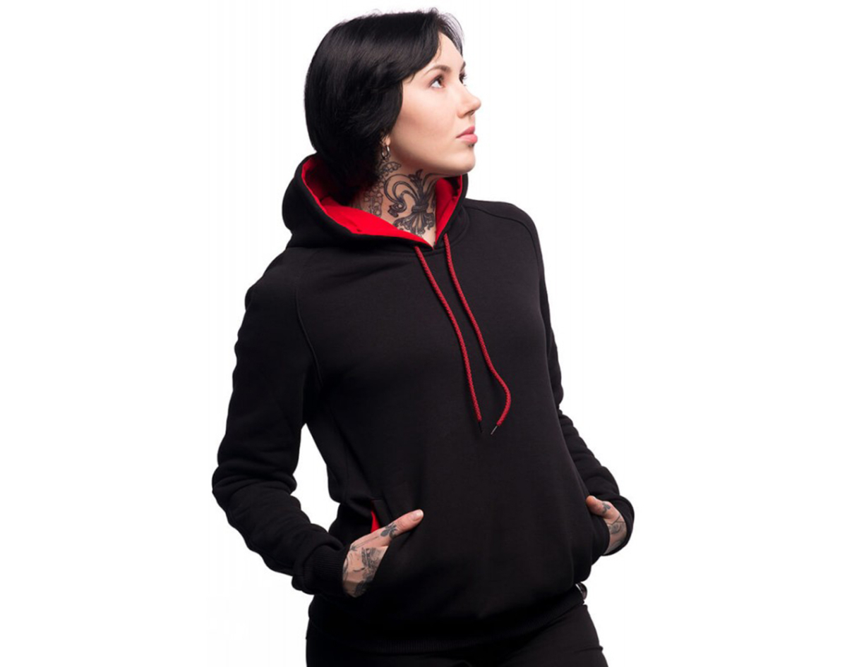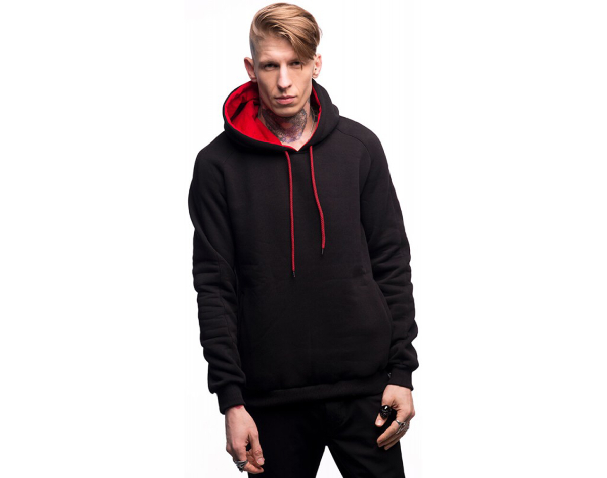 Inside a red hood. The hood is tightened with a red lace. Mortise pockets on both sides, inside red.