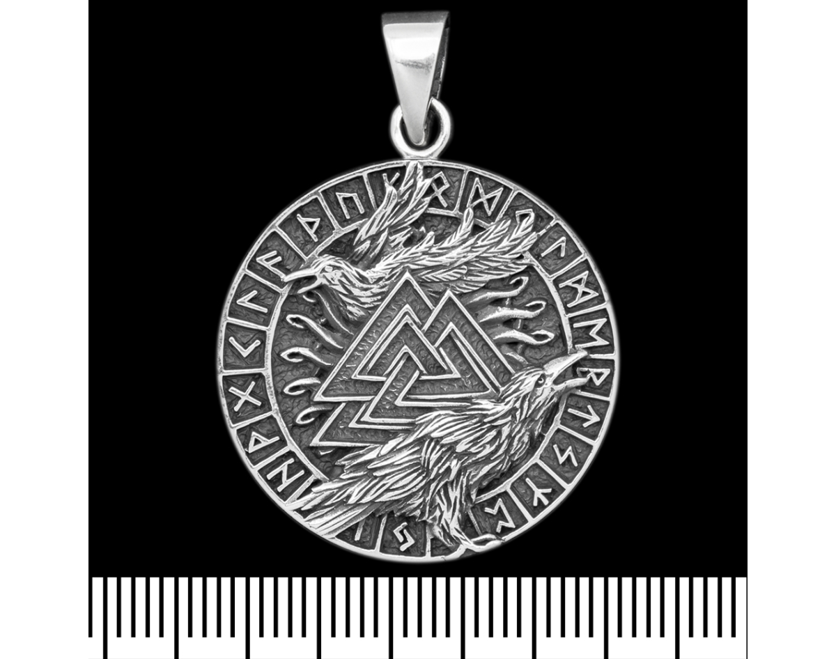 Valknut pendant with ravens Odin in futark (silver, 925 sample) (sp-217) 6.7 grams, diameter 29 mm, size of the eye for the chain 6x4 mm